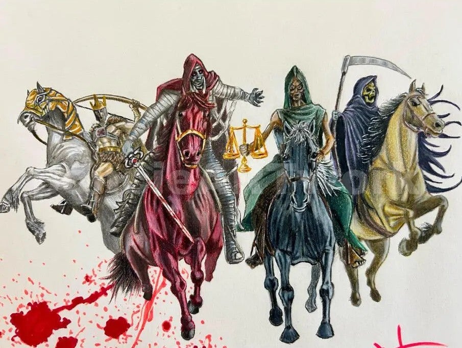 Witness the striking imagery of the Four Horsemen of the Apocalypse in this powerful art print by poncieARTwork, inspired by the Book of Revelation. Created in 2024, this dramatic piece is part of an open edition, hand-signed and numbered by the artist Poncie, and comes matted with a Certificate of Authenticity (COA).